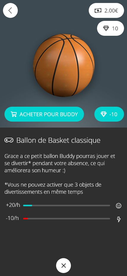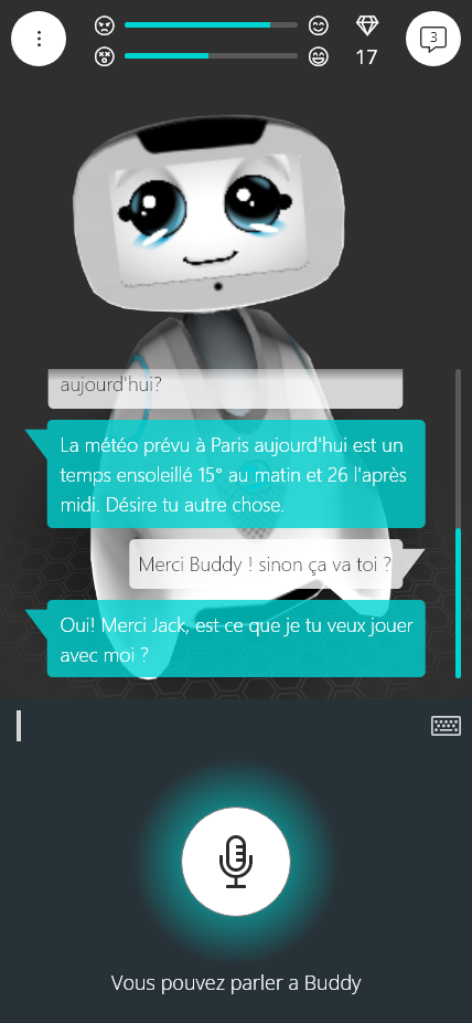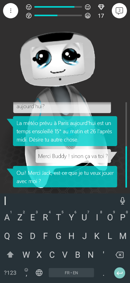 Chez Blue Frog Robotics, j’ai participé à la conception de My Buddy App, une application mobile mêlant intelligence artificielle et interaction émotionnelle, dans l’esprit d’un Tamagotchi augmenté par ChatGPT. L’objectif : prolonger l’expérience du robot Buddy sur smartphone, en créant un lien entre le compagnon physique et sa version numérique pour les utilisateurs disposant du modèle réel. J’ai bénéficié d’une grande autonomie sur ce projet, en pilotant à la fois la conception UX/UI et la réalisation technique. Pour optimiser les performances de l’application, j’ai également modélisé une version low poly du robot Buddy, intégrée en 3D temps réel.
